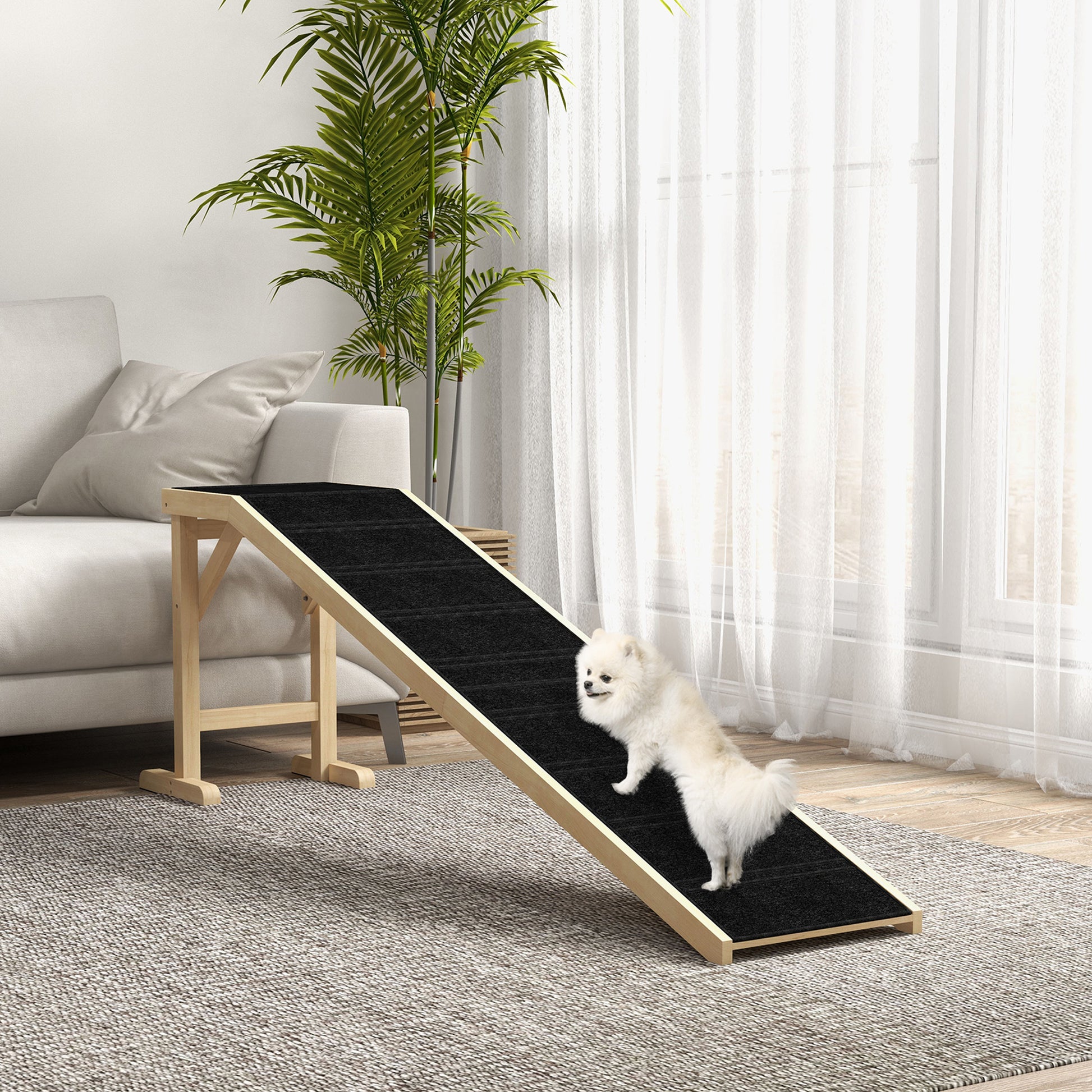 This small and large dog ramp for cats and puppers lets your four-legged friend take a pause at the top of the incline before making their next move onto the couch, bed, etc. An easy design for a less troublesome pathway allows for safer travel from point A to B, catering to your furry friend's needs. Made with a low, easy slope, this pet assist ramp from PawHut features strength and durability, while its construction is made from high-quality pine wood for daily use.